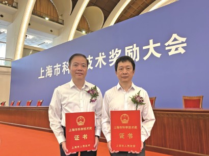 项目完成人上海交通大学蒋兴浩、蚂蚁集团王维强在上海市科学技术奖励大会现场。
